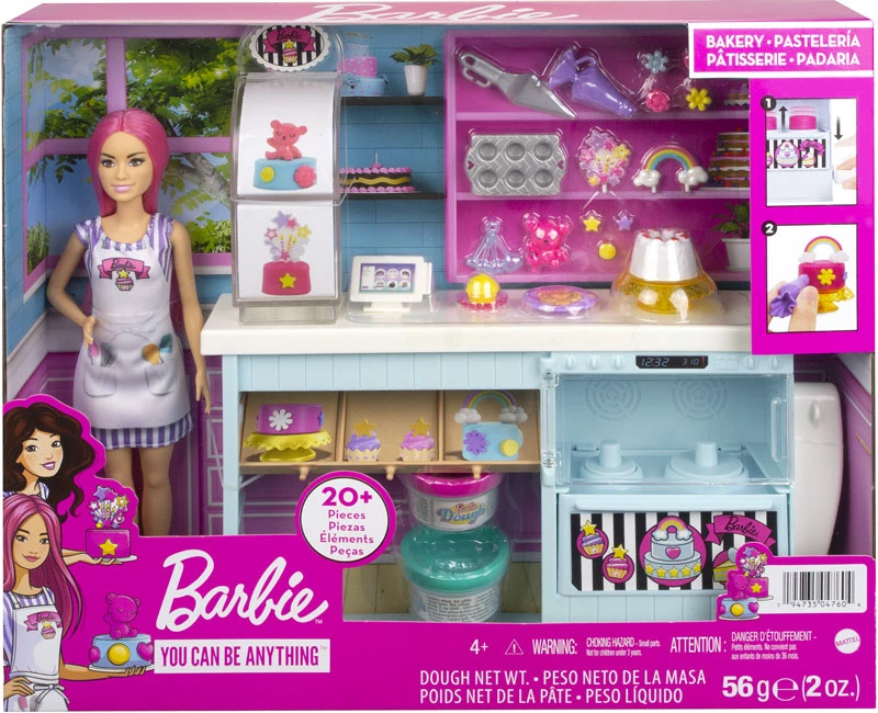 Explore the experience of running a bakery with the Barbie® Bakery Playset! Kids love baked treats and with this playset they can run a bakery and make yummy cakes and other treats! Playset includes Barbie® bakery petite doll (12 inches) with cool pink hair dressed in a cute striped dress with smock. The bakery station has three play areas to bake, decorate and display plus comes with 20+ accessories for storytelling fun. Kids can use two kinds of dough (pink or blue) and put it in the oven, pull the lever and watch the cakes rise for cake-making fun! They can then decorate the cake on the pedestal and use cake decorating accessories and toppers to design the cake exterior. Playset includes bakery station, Barbie® 12 inch doll, 2 dough containers, piping bag stamper, spatula, decorations, toppers, cupcake tin, cookie plate and more. Barbie® doll can hold some of the accessories for even more realistic play fun. Doll cannot stand alone. Colors and decorations may vary. Makes a great gift for ages 3 years old and up.