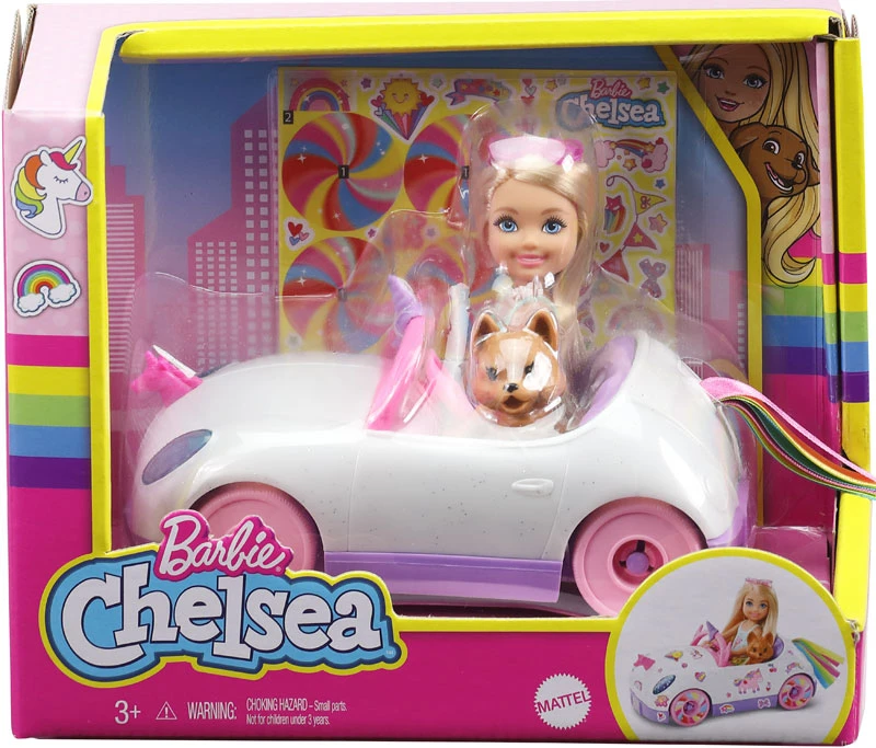 Young imaginations will discover endless playtime possibilities when they hit the road with Chelseaâ„¢ doll and her pet puppy in their adorable, unicorn-inspired car! With room for Chelseaâ„¢ doll and her pup, the super-cute vehicle features an open top, a glittery white body and purple trim. Fantastical finishing touches include a silvery unicorn hood ornament and rainbow streamer tail. Kids can use the included sticker sheet to customize Chelseaâ„¢ doll’s ride, then seat the pals inside and take them on all kinds of adventures! With so many sweet details, this Chelseaâ„¢ playset makes a great gift for 3 to 7 year olds. Doll cannot stand alone. Colors and decorations may vary.