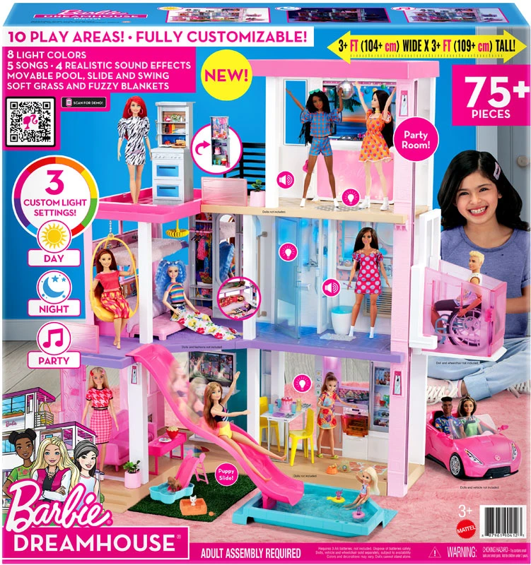 When young imaginations open the door to the Barbie Dreamhouse, they’ll discover unlimited storytelling possibilities! Standing 43 inches tall and 41 inches wide, this dreamy dollhouse inspires 360-degree play with three floors and 10 indoor and outdoor living areas. Move right in and customize the space — the grass area and pool can be placed in multiple configurations on the first and third floors, and the slide fits in four second-floor locations. After designing the layout, set the scene for any story with three songs, two soundscapes and customizable light settings! Then, double the fun with transforming furniture — the BBQ grill reverses to reveal a dessert buffet, the entertainment center reverses to reveal a pet play area, and a bunk bed folds down from the wall. Kids can play out any story, from an ordinary day to the ultimate get-together with a kitchen, living room, dining room, bedroom, bathroom, pool, balcony, party room and more. Lift and lower Barbie doll and her friends in the working elevator, fill the pool with water to make a splash, soak up some sun on the third-floor balcony and rooftop deck, and host a pet playdate with a puppy pool and slide. Storytell