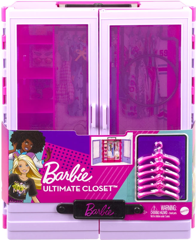 Pack Barbie doll for a world of possibility! The Barbie Ultimate Closet is designed for portability with a carrying handle. Decorated with Barbie signature style, the closet features a purple exterior with a pink interior and translucent doors for a peek into the wardrobe. Six included hangers help keep fashions organized and tidy and lots of shelf space is perfect for the amazing accessories (not included). A fold-out rack is used to hang clothes and is handy for dress-up style changes. Closet can also store a doll (not included). The easy carrying handle keeps the portable closet ready to travel, anywhere, for any occasion. Includes portable closet and six hangers; doll, fashions and accessories not included. Colors and decorations may vary. For kids 3 years old and up.