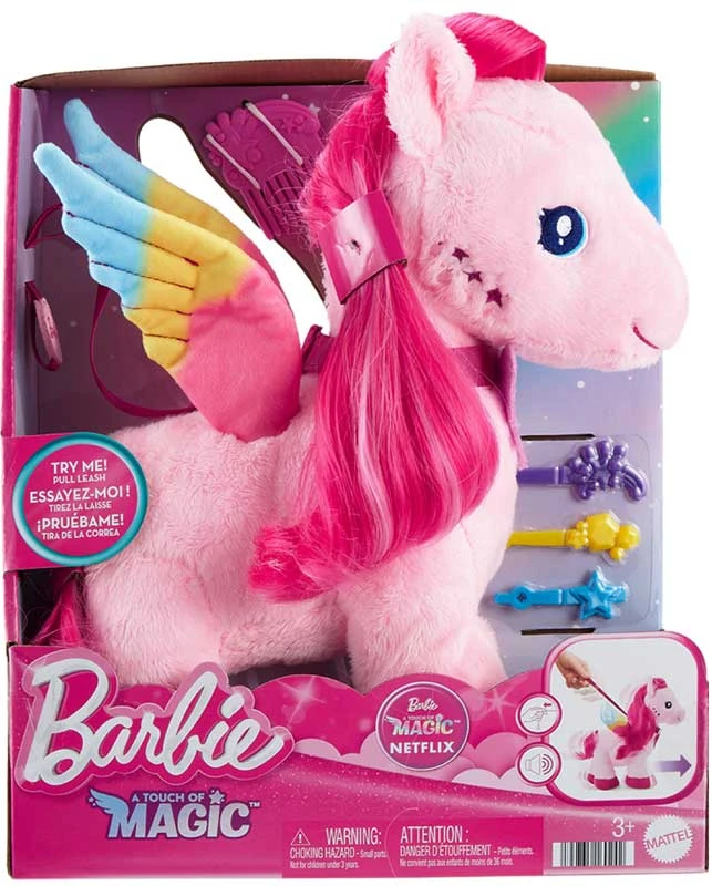 Playtime just got more enchanting with the Barbie Walk & Flutter Pegasus! This adorably pink plush can walk all by herself and flap her colourful wings at the same time! She also comes with a musical sound feature, as well as a hair comb and three barrettes for her mane. Kids can play out their favourite scenes from Barbie A Touch of Magic, or come up with fantastical adventures of their own! 3 x AAA batteries included. Colours and decorations may vary.