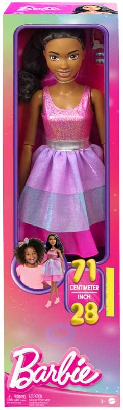 This poseable, large Barbie doll has the same Barbie charm that kids know and love, but expanded to a 28-inch-tall frame. After all, more Barbie means even more fun! She rocks a shimmery pink dress accented by a silver belt, a necklace, and two hair clip accessories. Doll cannot stand alone. Colours and decorations may vary.