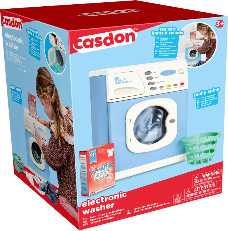 “It’s never been easier to keep on top of the laundry, thanks to the Electronic Washer! This fully functioning miniature Electronic Washer comes equipped with realistic sounds and lights (and a working door!), making it the perfect accomplice for Little Helpers who love assisting around the home. Whether popping on a dark wash or getting those whites crisp and clean, the Electronic Washer is stacked with enough features to get the job done in a jiffy. It has two spin speeds and an ‘on’ light, encouraging little ones to spark their imagination and explore realistic play. Not only this, but the washer comes with a laundry basket and detergent box, making the washing experience all the more fun! While dolls’ clothes aren’t included, there soon won’t be a single mucky pup in sight.