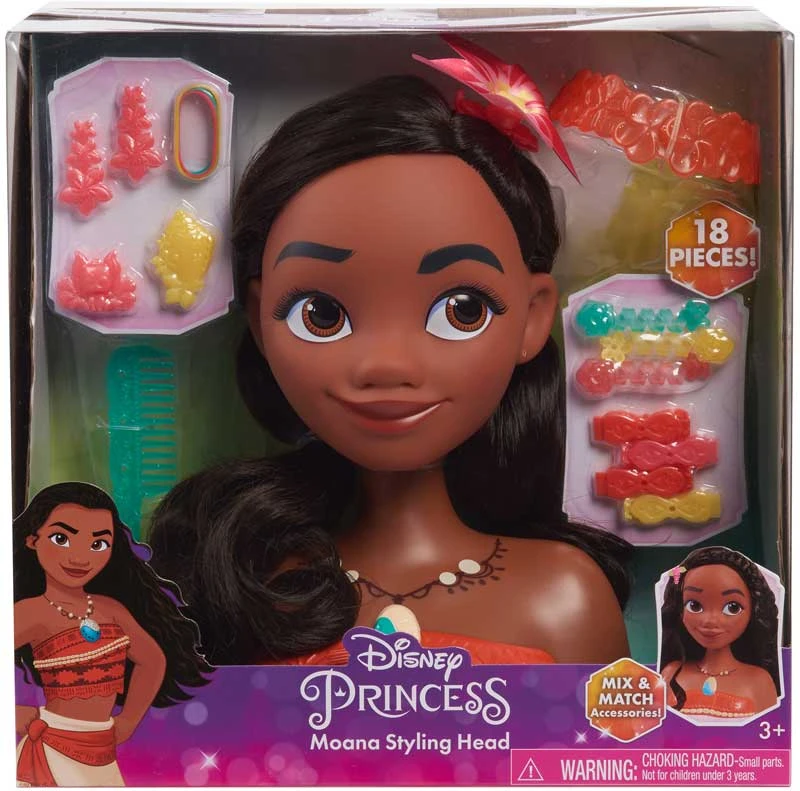Disney Moana Styling Head comes with long black hair and 13 styling accessories.
