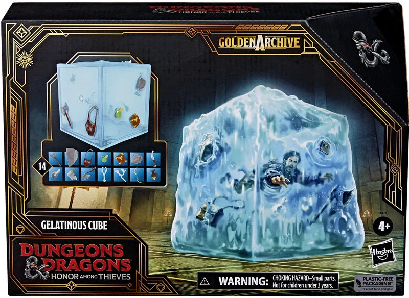 Watch out, it’s a Gelatinous Cube! This 15-cm-scale collectible is compatible with D&D 15-cm figures that can be posed out inside with the ‘invisible’ stand. It includes 14 snap-in accessories to add to the scene. This cubic collector figure will probably look cool in your display, looking menacingly over your other Golden Archive figures. Figures each sold separately. Subject to availability. OPEN THE DOORS TO THE GOLDEN ARCHIVE. These 15-cm-scale, premium action figures and collectibles are inspired by Dungeons & Dragons lore and entertainment from nearly 50 years. Featuring the deco, articulation and poseability one expects from Hasbro collectible figures with the characters, classes and species you love from D&D. TM & ©2023 Wizards of the Coast LLC Hasbro and all related terms are trademarks of Hasbro.