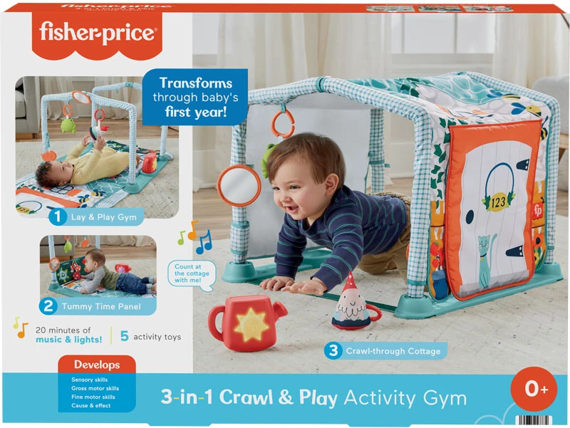 The Fisher-Price 3-in-1 Crawl & Play Activity Gym transforms through your baby’s first year to keep playtime going as they grow. First, the comfy play mat and overhead toys offer lay-and-play fun for newborns. Then, an extra panel folds up for tummy time fun with repositionable activity toys for engaging sensory play. Finally, the gym transforms into a cottage-themed, crawl-through tunnel with fun peek-a-boo surprises and a light-up musical toy watering can to “sprinkle” in some early pretend play.