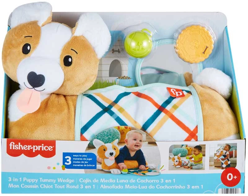?Fisher-Price Baby Tummy Time Toys, 3-in-1 Plush Puppy Wedge with BPA-Free Teether Rattle and Mirror Toys. The Fisher-Price® 3-in-1 Puppy Tummy Wedge helps make tummy time a little less “ruff” for your baby. This cute and supportive pup is always ready to play as your little one grows from tummy time to sit-at play, to early role-play “care” for their puppy pal. The plush dog tummy wedge features a crinkle panel and 3 activity toys, which help strengthen your baby’s gross motor skills and engage their senses of sight, hearing and touch.