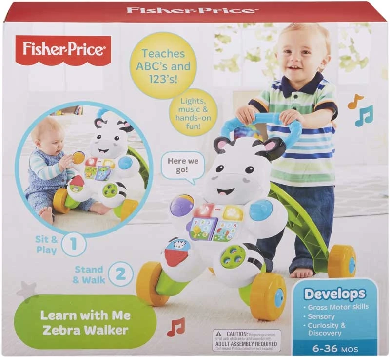 From teaching first words to encouraging first steps, the Fisher-Price® Learn with Me Zebra Walker is the kind of first friend you want for your little one! Spin, flip, roll, twist. This zebra?’s full of busy, hands-on activities for sitting babies. Your baby can turn the book page or press the light-up buttons to hear all about ABC?’s & 123?’s through sing-along songs and phrases with new animal friends! And when baby?’s learning to walk, the easy-grasp handle and sturdy 4-wheel base help steady those wobbly first steps.
