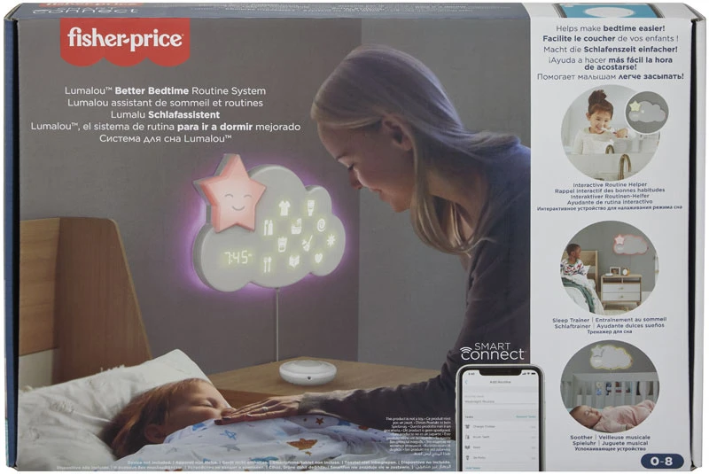 The Fisher-Price Lumalou Better Bedtime Routine System helps make getting your child to bed easier. The wall-mounted, interactive helper guides kids through the nighttime routine, rewarding them as they complete each task. The Lumalou system also serves as an infant to toddler sleep-training tool and sound machine with lights and a sleep expert-approved music playlist to help your child settle down for sleep. Easily customize and control your child’s daily tasks, sleep timers, as well as the music, sounds and lights with the convenient Smart Connect app.