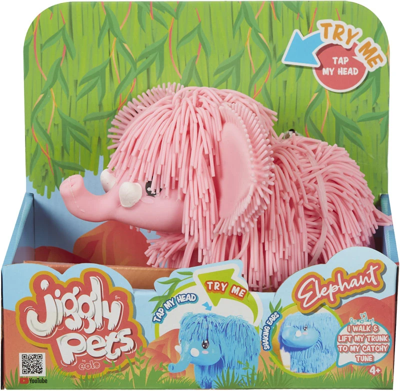 Jiggly Pets Elephant is the cutest walking Elephant! Simply tap the head to bring your Elephant to life. This electronic Elephant walks, jiggles and lifts their trunk whilst playing a catchy tune! Watch Elephant move to the rhythm of the music! This adorable Elephant is so soft to touch with stretchy pink rubbery face and body. It’s the cutest, funniest Elephant?” you’ll have so much fun as you watch your Elephant walk and jiggle to the music! No Elephant dances more adorably than Jiggly Pets Elephant. It’s the cutest walking Elephant! Listening to the catchy tune is sure to make you want to dance too! Take your Elephant friend with you wherever you go!