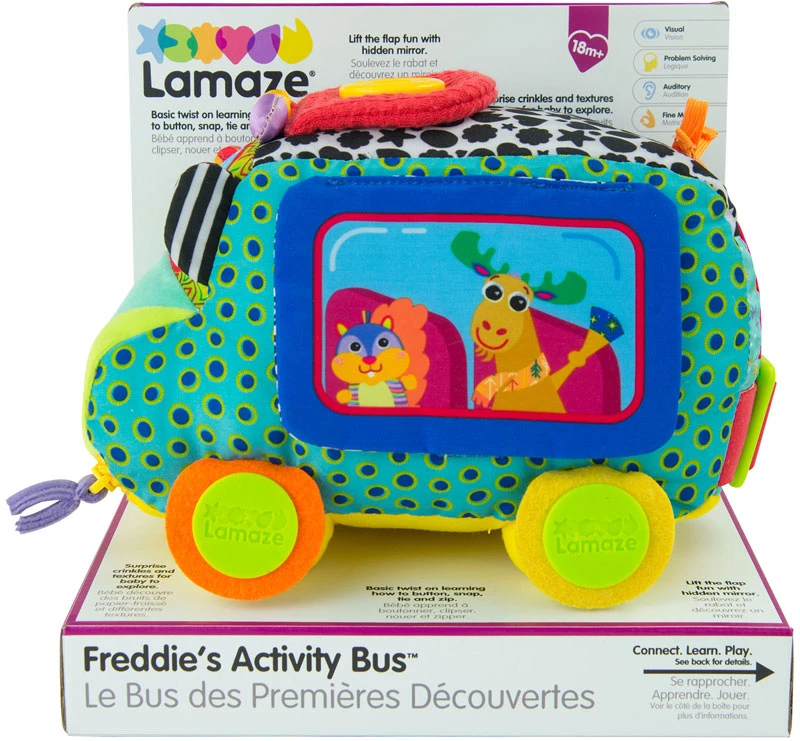 Getting ready for preschool or day care is easy with Lamaze’s Freddie’s Activity Bus. Help your growing baby learn to snap, zip, button and tie with Freddie and his colourful bus. The bus has a button top, snappy wheels, and a hidden friend who peeks out from under the zipper. Freddie’s bus also features surprise crinkles and textures for baby to explore and a flap for fun with a hidden mirror. It’s never too early to start thinking about school readiness!