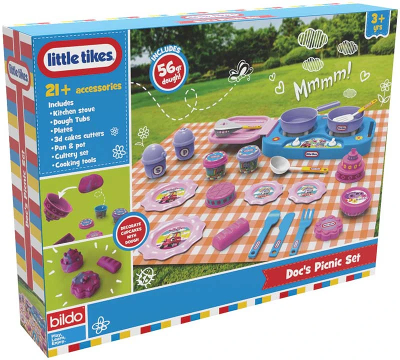An unforgettable playtime feast! Set the table with style: With a charming design, this picnic set brings magic to playtime gatherings. Plates, cutlery, and cups perfectly complement their culinary creations. Let imagination soar: The set includes a cooking hob with pans. Little chefs can whip up their favourite dishes, stirring their culinary masterpieces with joy. The set features colourful cakes for imaginative play. This set encouragea social interaction and imaginative play. Designed for small hands, promoting fine motor skills and coordination.