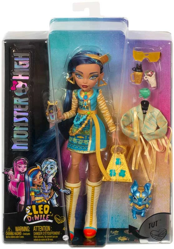 Monster Highâ„¢ Doll, Cleo De Nileâ„¢ with Accessories and Pet Dog, Posable Fashion Doll with Blue Streaked Hair????Consumer CopySchool is back in session, and the Monster Highâ„¢ ghouls are showing up in scream-tastic style! Cleo De Nileâ„¢ doll struts down the Monster Highâ„¢ hallways in a fashion inspired by her royal scaritage, featuring a royal blue dress with mummy wrap-inspired sleeves and a gore-geous chain belt. Her scary-chic look is complete with knee-high boots, a pyramid-shaped scarab-studded backpack and glam, golden accessories. Take Cleo De Nileâ„¢ doll’s look to the next level with a freaky-fabulous fringe jacket and accessories. And inspire spooktacular storytelling with her creepy-cute pet puppy, Tutâ„¢! Doll cannot stand alone. Colors and decorations may vary.