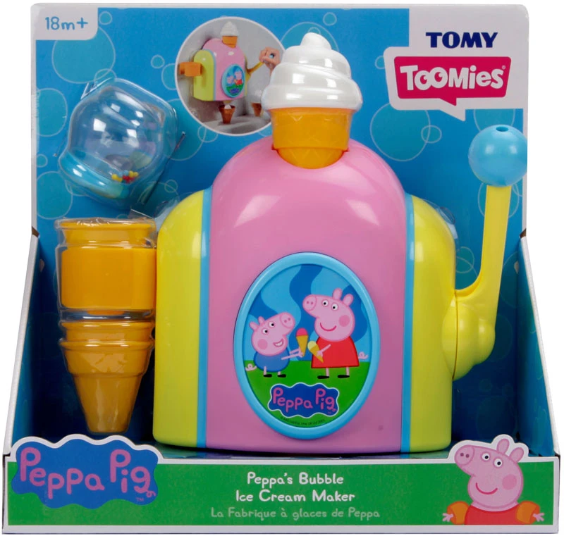 Bring the seaside fun indoors with this Peppa Pig playset! Customers will soon be forming a queue to join in and have a go at making pretend ice cream with this clever bubble maker. The unit pops onto any bathroom wall or the sides of your tub thanks to hidden suction pads. All you need to do is reach for a few drops of bubble bath (not included), add water and start pumping. Pull down on the lever and see the cones fill up with lovely looking pretend ice cream as it foams its way out of the nozzle underneath! Included are three flat-bottomed ice cream cornets designed to sit steadily on the sides of the bath. There?’s also a rattling sprinkles shaker included so little ones can pretend to add the finishing touch. Part of the Toomies Peppa Pig toys range, this simple yet effective set brings its own magic to any bath time routine. The Bubble Ice Cream Maker encourages collaborative role play and helps refine motor skills as children discover cause and effect sequences, learn to share and become more confident around water. Always drain after use and leave to air dry. Clean the inside regularly by rinsing thoroughly with anti-bacterial or sterilising solution. No batteries required.