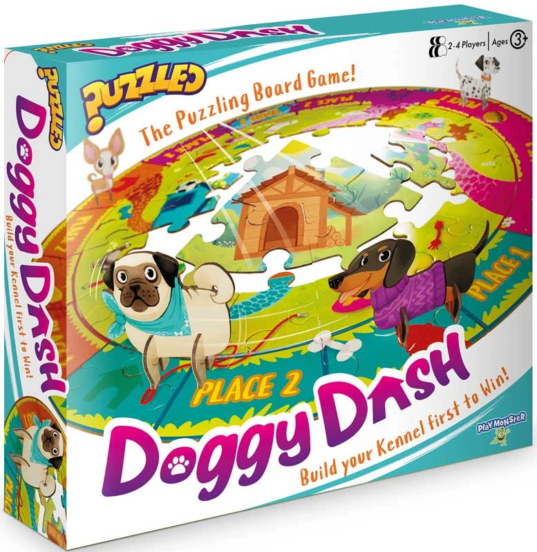 Puzzled combines a fast-paced board game with a problem-solving puzzle! Take your turn to spin the spinner and make your move, racing other players around the board. Collect puzzle pieces on the way to build your kennel and win! But beware… other pooches may take your kennel pieces to slow you down! When the board is complete, race to spot the hidden objects! The fastest player to find the matching objects wins a ‘Best in Show’ rosette! Are you ready to go head-to-head in the ultimate Doggy Dash race? A fun children’s game for 2-4 players!