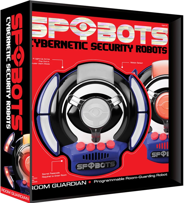 This motion-activated robot provides round-the-clock room security! Just place it on your door, and program it with your secret code. Anyone who wants to enter must know the code. But trespassers beware: Enter the wrong code or no code at all, and Room Guardian goes into “Intruder Alert Mode,” flashing super-bright lights and sounding alarms! Room Guardian is one of three SpyBots Cybernetic Security Robots – T.R.I.P, SpotBot and Room Guardian. Collect them all!