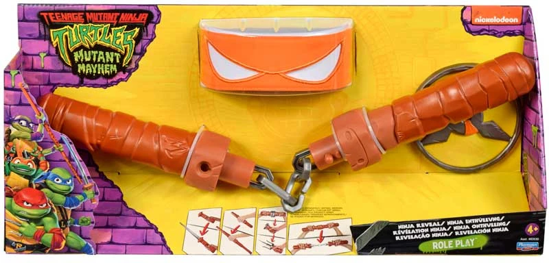 Become Leonardo the leader, “Brainiac” Donnatello, comedic Michelangelo or muscle-bound Raphael from the hit Teenage Mutant Ninja Turtles Mutant Mayhem movie! Transform yourself into your favourite character! Tie on your bandana, grab your weapon and pick up your throwing star to be instantly transformed! Leonardo set comes with his signature katana sword, Donatello with Ninja Reveal Bo Staff, Michelangelo with powerful nunchaku and Raphael with twin sais. When the battle’s won, simply conceal the weapon back and you’re ready for the next fight!