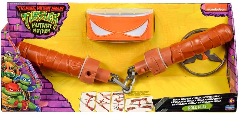 Become the comedic Michelangelo from the hit Teenage Mutant Ninja Turtles Mutant Mayhem movie with Michelangelo’s Ninja Reveal Role Play set! Tie on Mikey’s bright orange bandana, grab his powerful nunchaku and throwing star and, in an instant, you’ve become Michelangelo! When the baddies attack, unleash the power of Mikey’s nunchaku with the press of a button and a twist of the wrist and pull the handles apart?”now you’re ready for the fight! When the battle’s won, simply drop the chain into the handle, twist to conceal it, and you’re ready for the next fight!