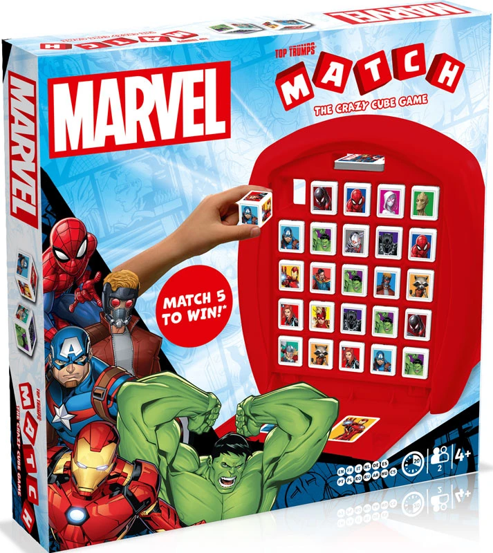 Battle alongside fifteen of the greatest Marvel heroes including Captain America, Iron Man, Spider-Woman, Black Widow and Miles Morales in Top Trumps Match, the Crazy Cube Game. Be the first to match five of these incredible Marvel characters in a row, in this awesome twist on the classic matching game. Knock out cubes to disrupt your opponent’s characters while lining up your own – but watch out for the twist! If one of your opponent’s Top Trump cards turns out to match your row of five, they steal the win. Will you soar to victory with Star-Lord, blast away your opponents with Rocket Raccoon or leave them in the dust with Captain Marvel? With officially-licensed artwork, this game is guaranteed to impress children of all ages, and it’s contained within a durable, portable carry case so you can take it wherever you go. Perfect for your next journey across the galaxy.