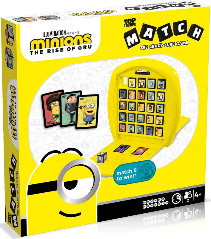 All of the most hilarious and mischievous characters from Minions: Rise of Gru come together in this exciting new edition of Top Trumps Match, the crazy cube game in which you and a friend race to be the first to match five in a row! With classic heroes and villains like Kevin, Stuart, Bob, the villainous Belle Bottom and even a young Gru, you can revisit the events of the 2020 hit sequel as you compete for victory. You must play strategically to outsmart your opponent, sabotage their lines and complete your own. Get five in a row of your favourite character and you could score a point – but if your opponent flips over a Top Trump card with your character on it, they can snatch the match instead! With a compact, protective design, multiple game modes and officially-licensed artwork, this game is guaranteed to be fun for everyone, not just supervillains.